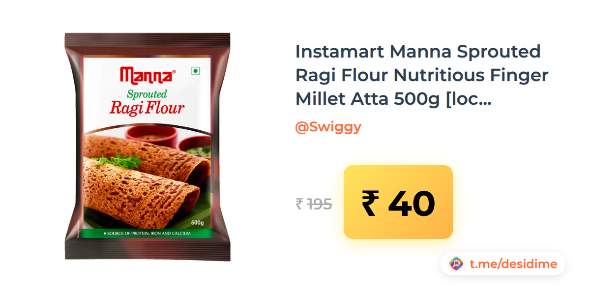79% off on - Instamart Manna Sprouted Ragi Flour Nutritious Finger Millet Atta 500g [location specific] - Rs. 40