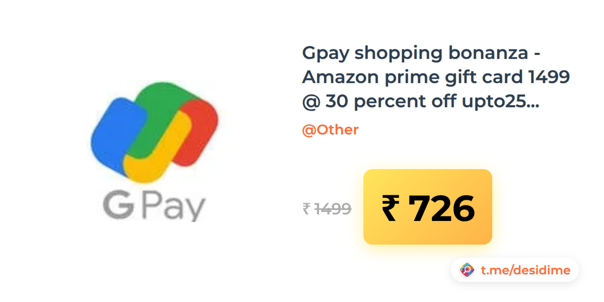 52% off on - Gpay shopping bonanza - Amazon prime gift card 1499 @ 30 percent off upto250+ combine offers extend to 52 percent off - Rs. 726