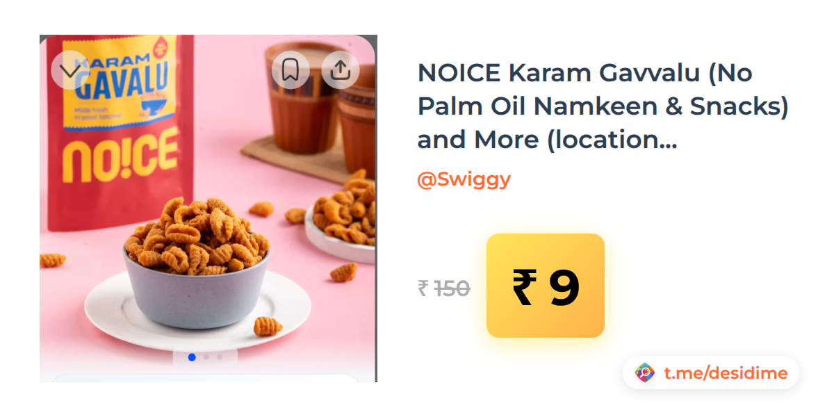 94% off on - NOICE Karam Gavvalu (No Palm Oil Namkeen & Snacks) and More (location specific) - Rs. 9