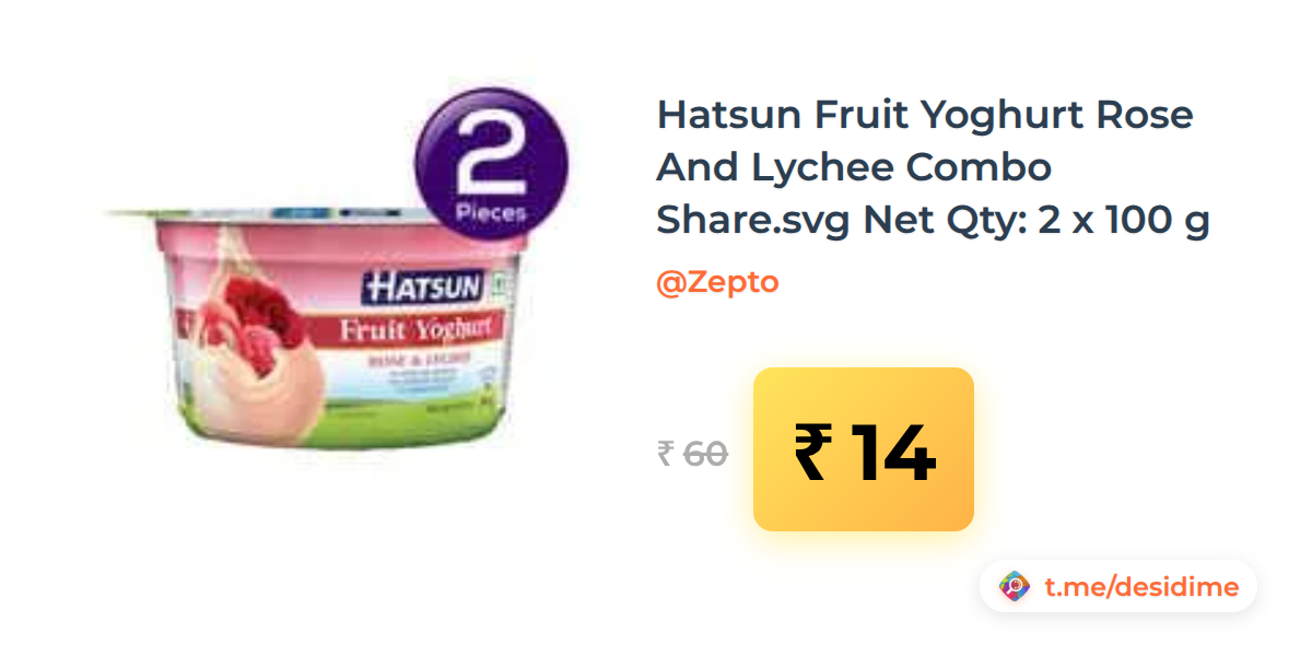 77% off on - Hatsun Fruit Yoghurt Rose And Lychee Combo Share.svg Net Qty: 2 x 100 g - Rs. 14