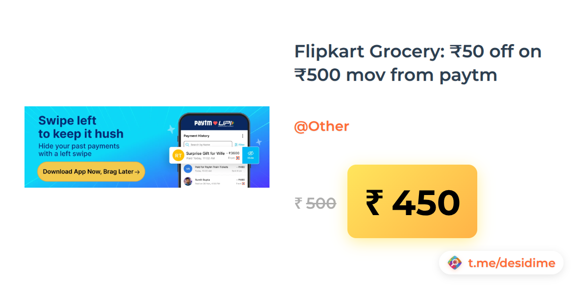 10% off on - Flipkart Grocery: ₹50 off on ₹500 mov from paytm - Rs. 450
