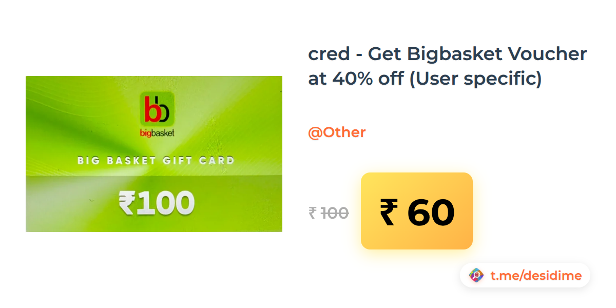 40% off on - Cred - Get Bigbasket Voucher at 40% off (User specific) - Rs. 60