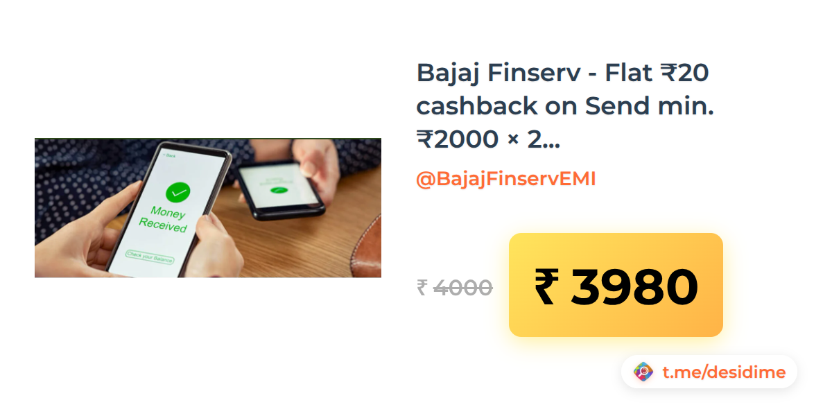 1% off on - Bajaj Finserv - Flat ₹20 cashback on Send min. ₹2000 × 2 times (Till 9 PM) - Rs. 3980