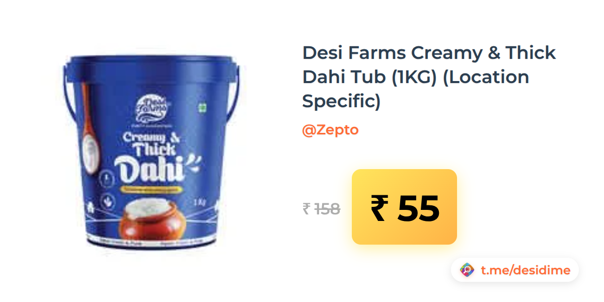 65% off on - Desi Farms Creamy & Thick Dahi Tub (1KG) (Location Specific) - Rs. 55