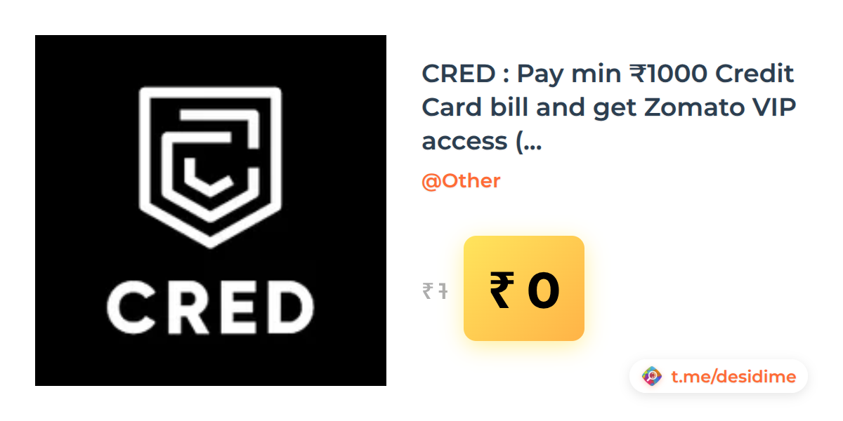 100% off on - CRED : Pay min ₹1000 Credit Card bill and get Zomato VIP access (User Specific) - Rs. 0