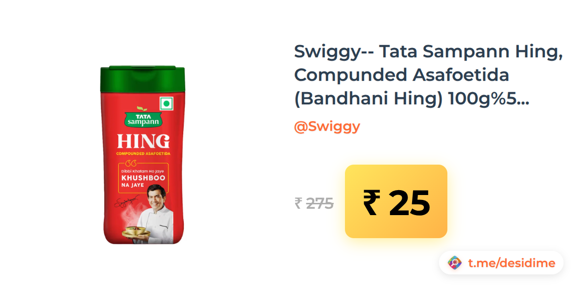 91% off on - Swiggy-- Tata Sampann Hing, Compunded Asafoetida (Bandhani Hing) 100g[Location Specific] - Rs. 25