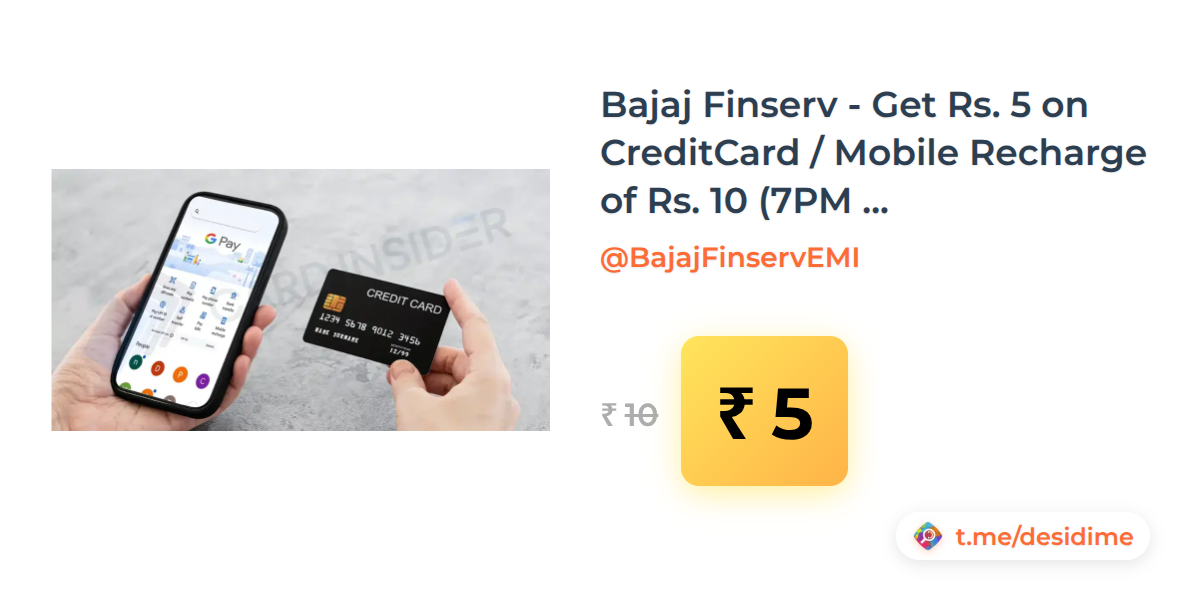 50% off on - Bajaj Finserv - Get Rs. 5 on CreditCard / Mobile Recharge of Rs. 10 (7PM - 9 PM ) - Rs. 5