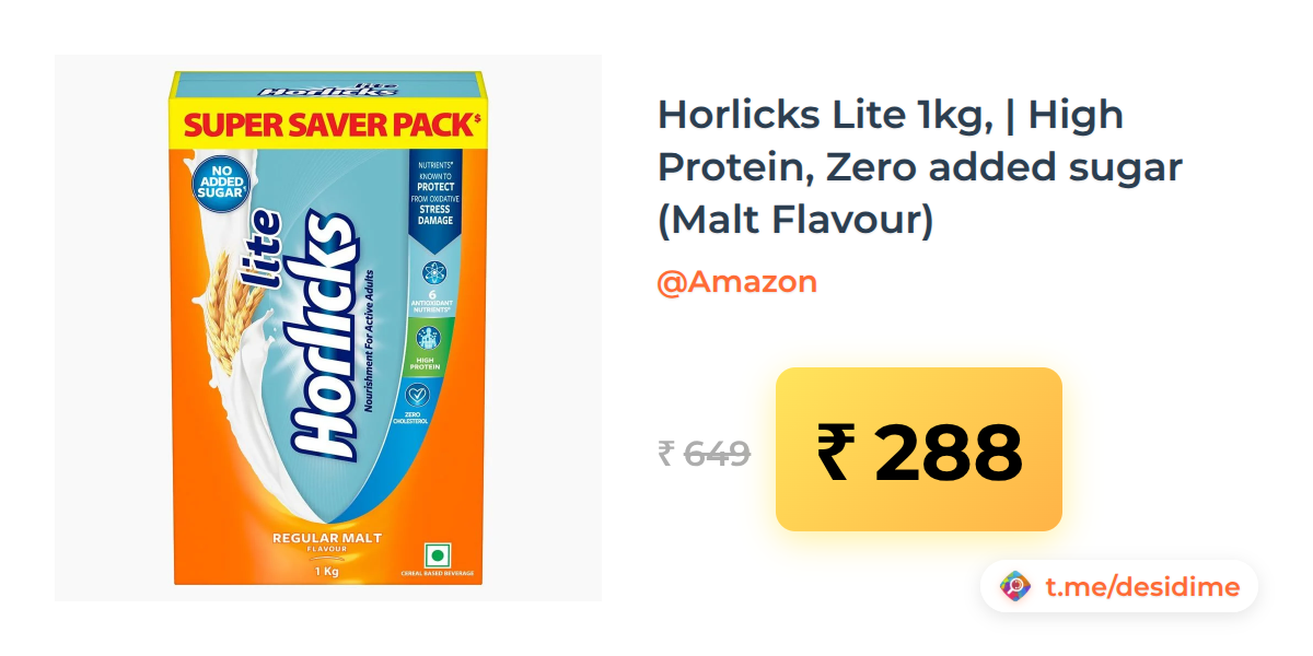 56% off on - Horlicks Lite 1kg, | High Protein, Zero added sugar (Malt Flavour) - Rs. 288