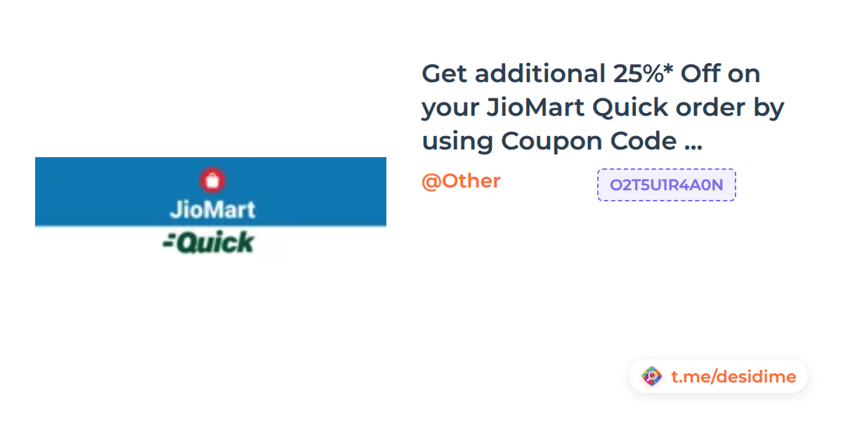 Get additional 25%* Off on your JioMart Quick order by using Coupon Code 'O2T5U1R4A0N' Maximum off amount Rs.50 Per order