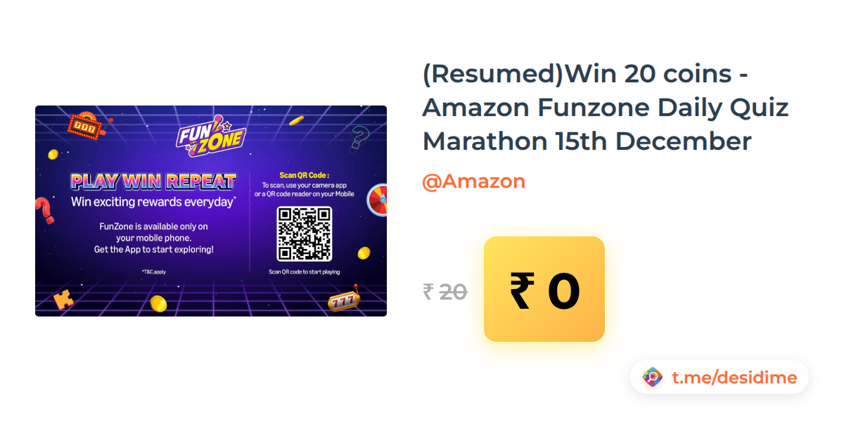 100% off on - (Resumed)Win 20 coins -Amazon Funzone Daily Quiz Marathon 15th December - Rs. 0