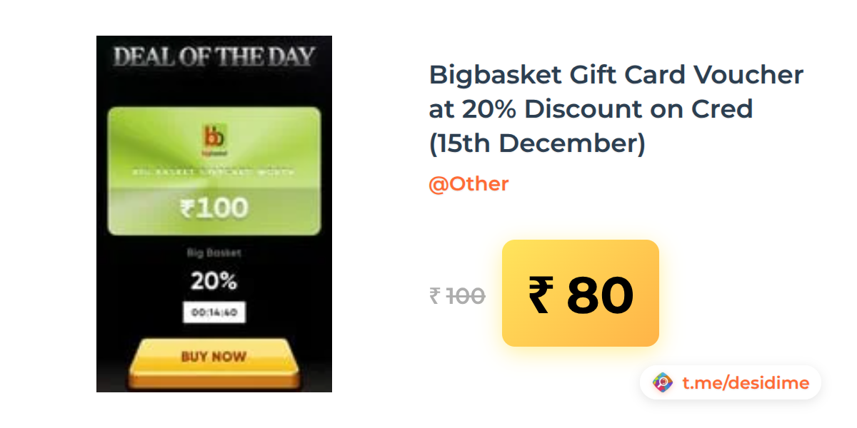20% off on - Bigbasket Gift Card Voucher at 20% Discount on Cred (15th December) - Rs. 80