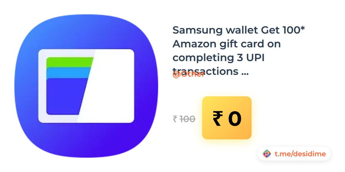 100% off on - Samsung wallet Get 100* Amazon gift card on completing 3 UPI transactions at merchant stores. - Rs. 0