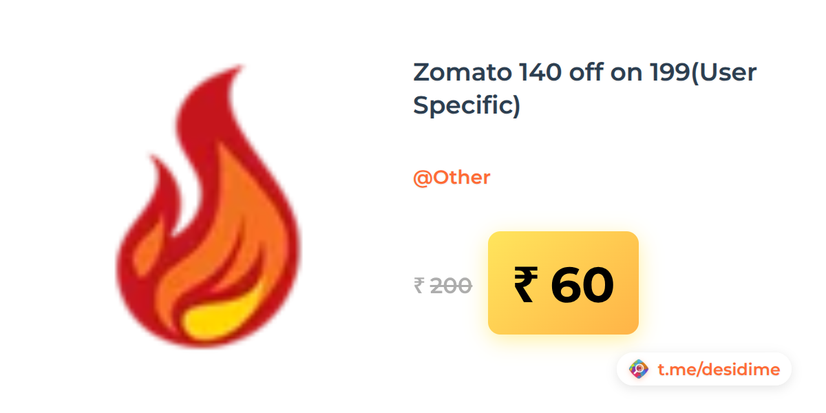 70% off on - Zomato 140 off on 199(User Specific) - Rs. 60