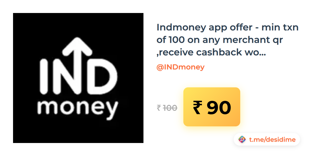 10% off on - Indmoney app offer - min txn of 100 on any merchant qr ,receive cashback working 2 times ( User specific) - Rs. 90