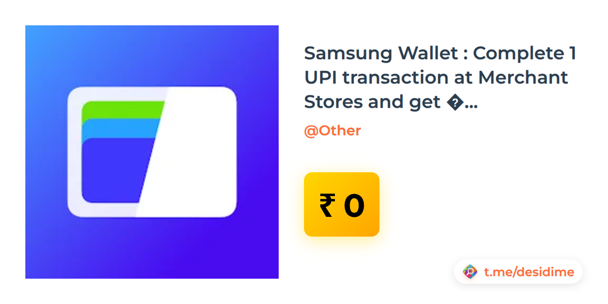 100% off on - Samsung Wallet : Complete 1 UPI transaction at Merchant Stores and get ₹50 Amazon Gift Card. Minimum transaction value ₹101 - Rs. 0