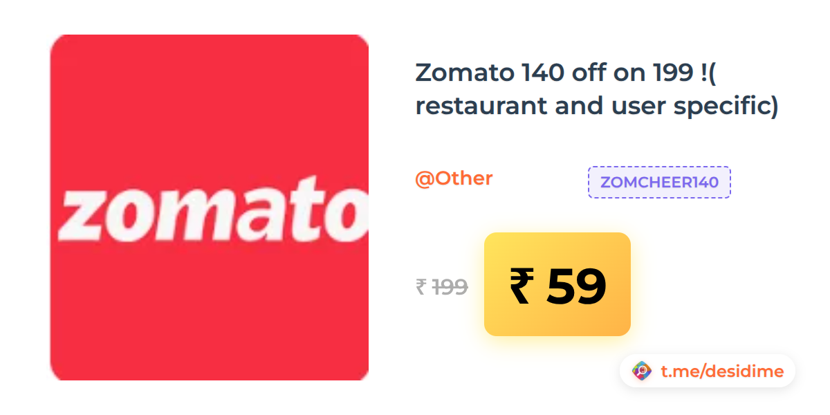 70% off on - Zomato 140 off on 199 !( restaurant and user specific) - Rs. 59