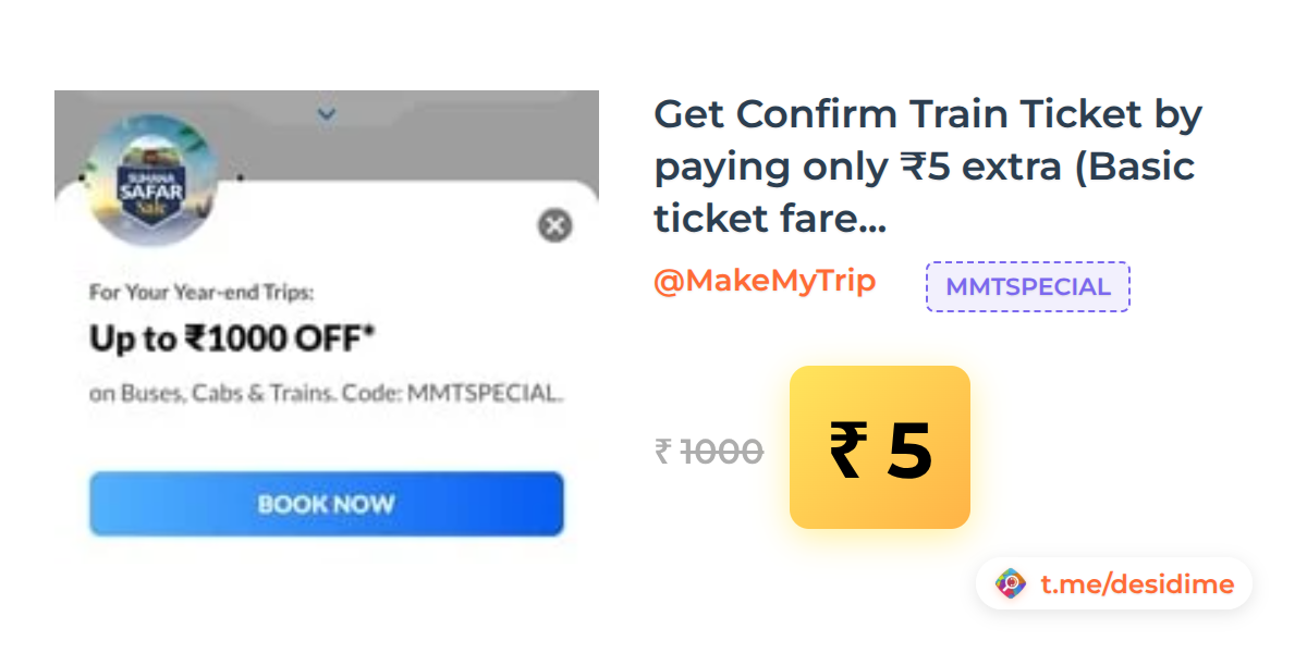 100% off on - Get Confirm Train Ticket by paying only β‚Ή5 extra (Basic ticket fare + β‚Ή5 confirm ticket fee) - Rs. 5