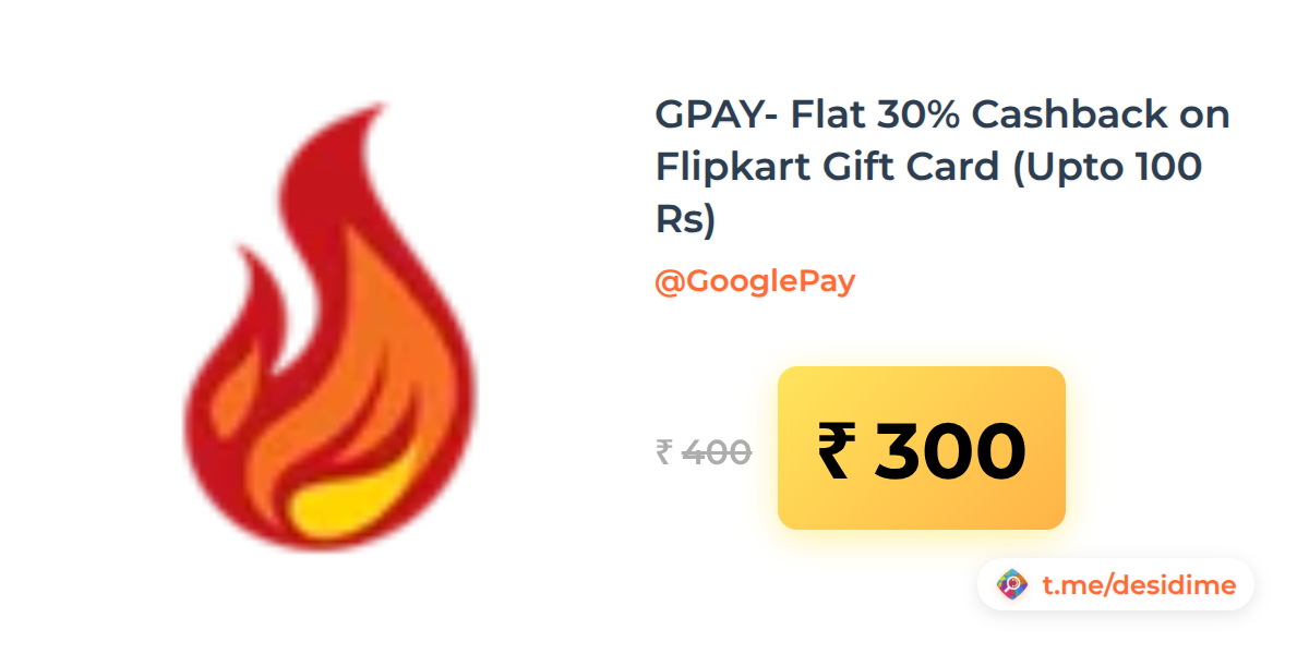 25% off on - GPAY- Flat 30% Cashback on Flipkart Gift Card (Upto 100 Rs) - Rs. 300