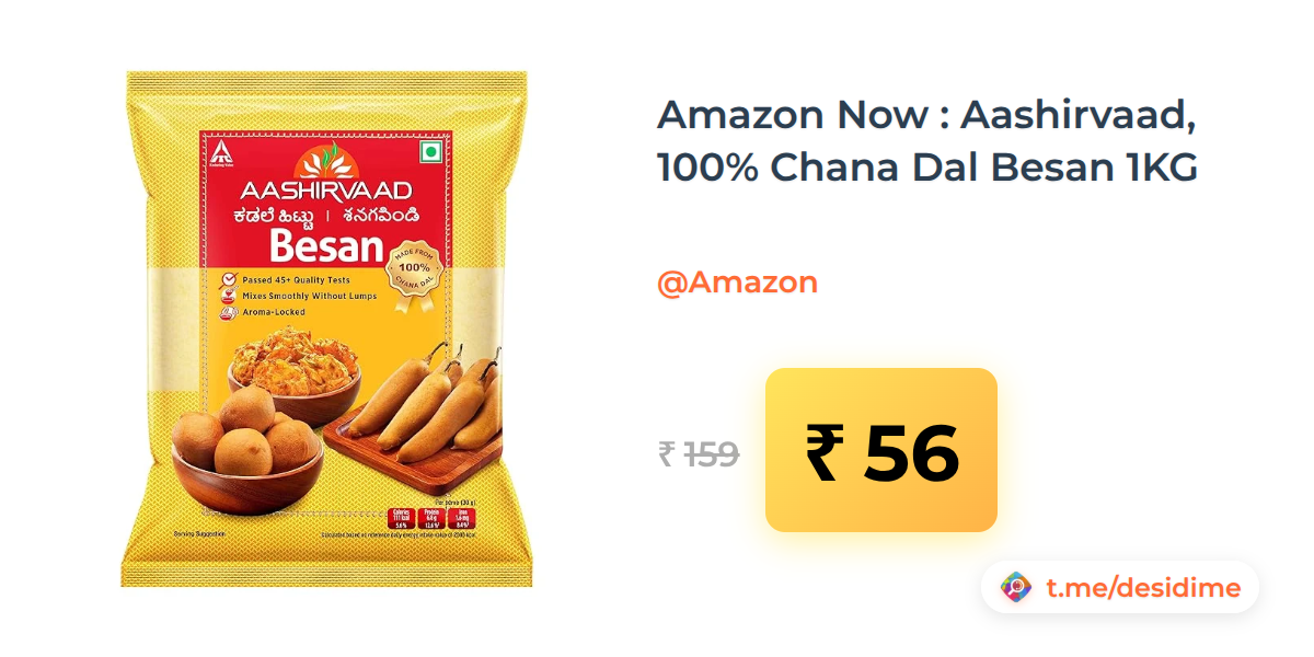 65% off on - Amazon Now : Aashirvaad, 100% Chana Dal Besan 1KG - Rs. 56