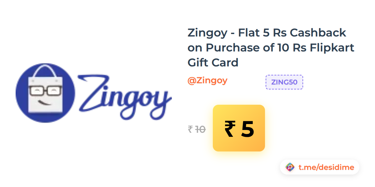 50% off on - Zingoy - Flat 5 Rs Cashback on Purchase of 10 Rs Flipkart Gift Card - Rs. 5