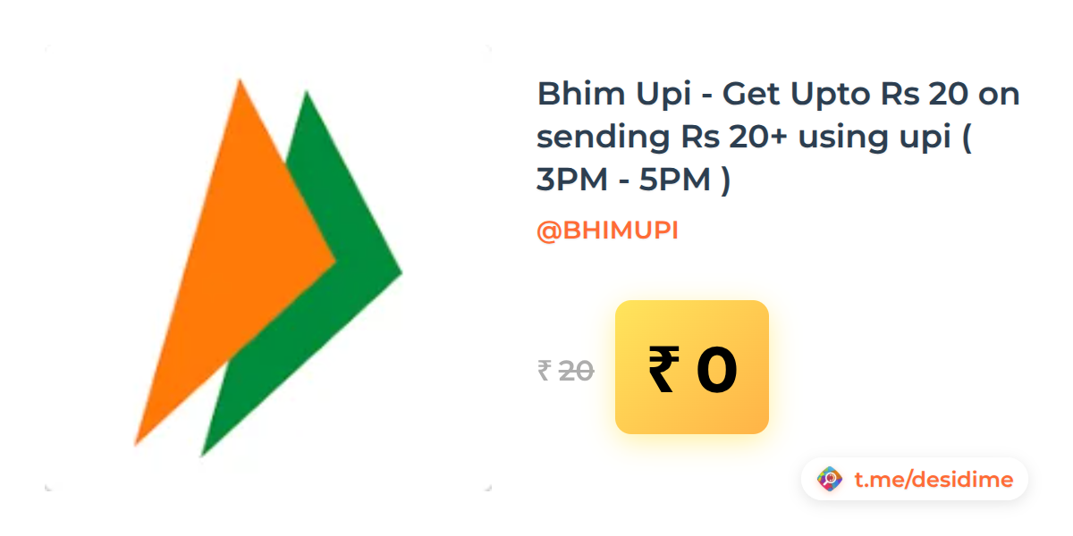 100% off on - Bhim Upi - Get Upto Rs 20 on sending Rs 20+ using upi ( 3PM - 5PM ) - Rs. 0