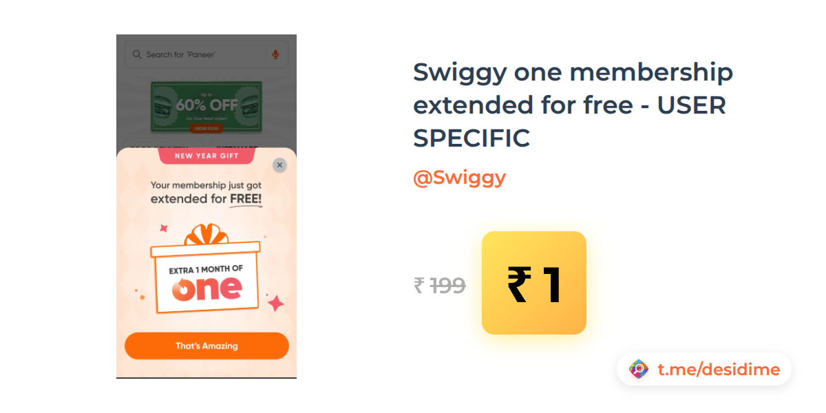 99% off on - Swiggy one membership extended for free - USER SPECIFIC - Rs. 1