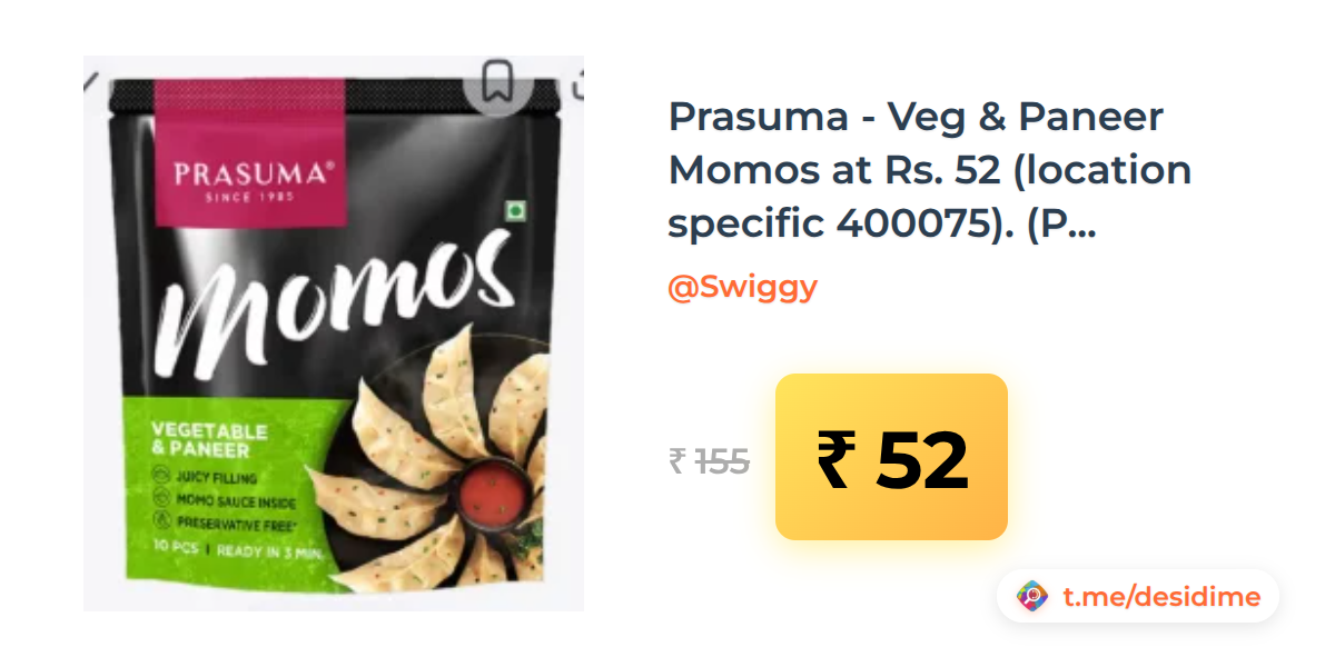 66% off on - Prasuma - Veg & Paneer Momos at Rs. 52 (location specific 400075). (Pack Of 10 ) - Rs. 52