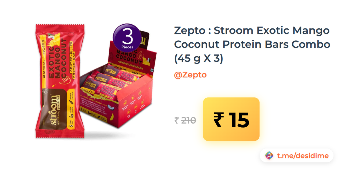 93% off on - Zepto : Stroom Exotic Mango Coconut Protein Bars Combo (45 g X 3) - Rs. 15