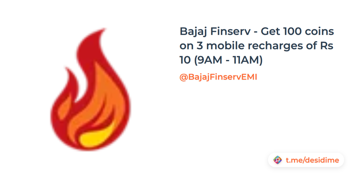 Bajaj Finserv - Get 100 coins on 3 mobile recharges of Rs 10 (9AM - 11AM)