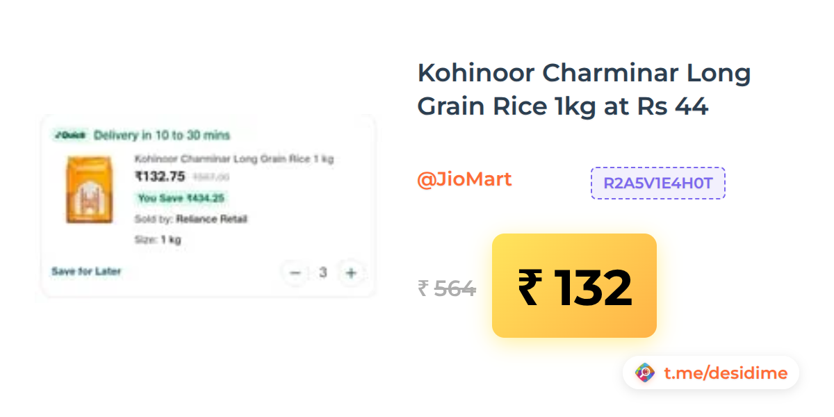 77% off on - Kohinoor Charminar Long Grain Rice 1kg at Rs 44 - Rs. 132