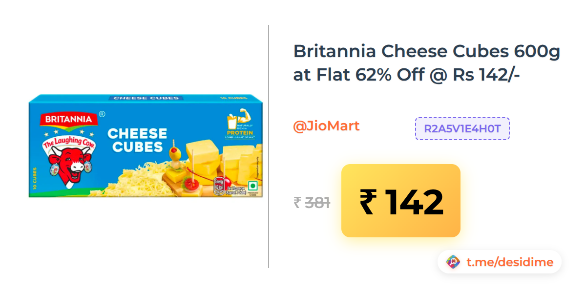 63% off on - Britannia Cheese Cubes 600g at Flat 62% Off @ Rs 142/- - Rs. 142
