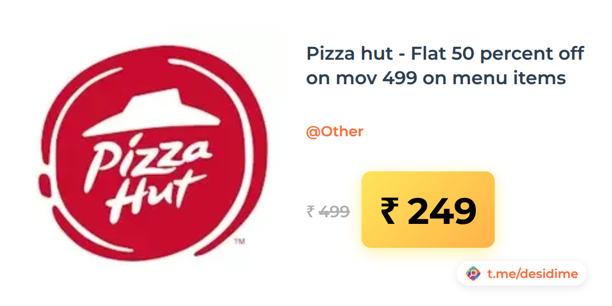 50% off on - Pizza hut - Flat 50 percent off on mov 499 on menu items - Rs. 249