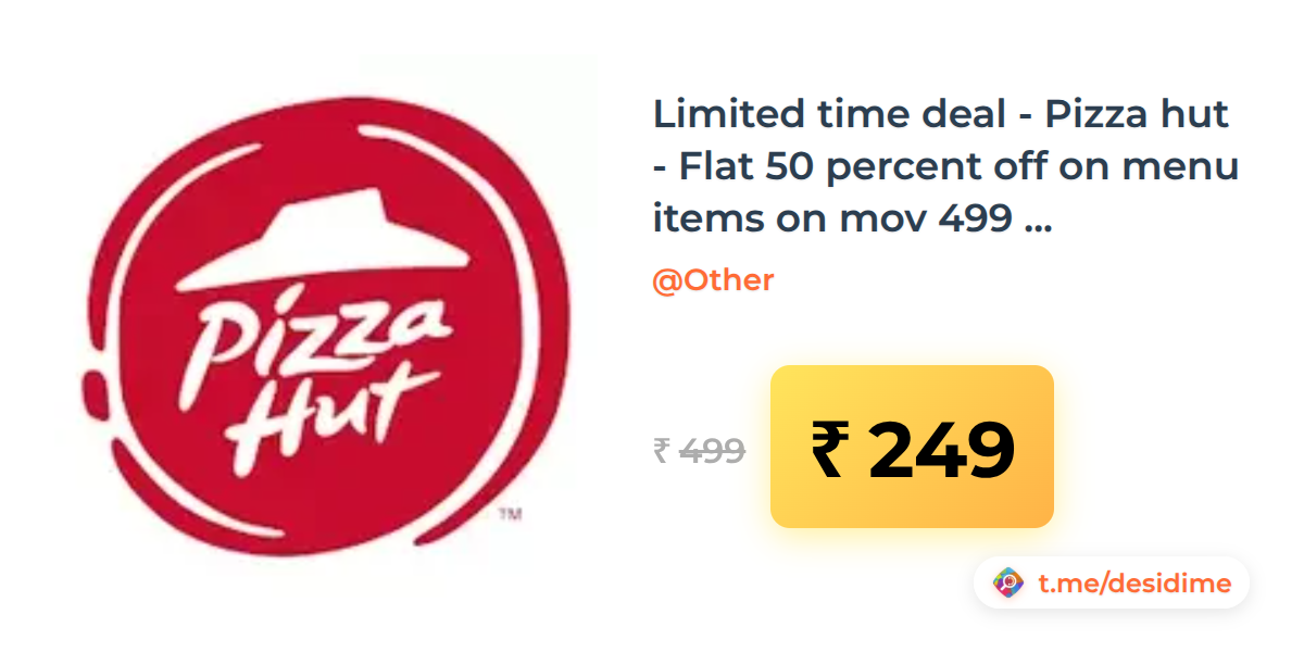 50% off on - Limited time deal - Pizza hut - Flat 50 percent off on menu items on mov 499 coupon automatically applied ( User specific might be) - Rs. 249