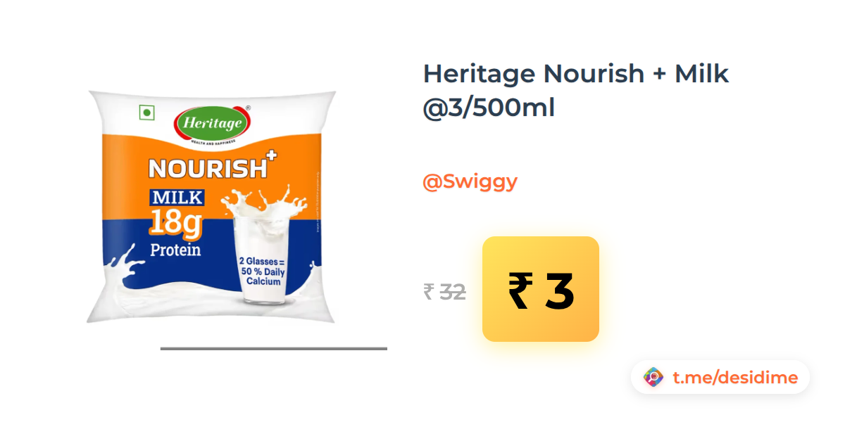 91% off on - Heritage Nourish + Milk @3/500ml - Rs. 3