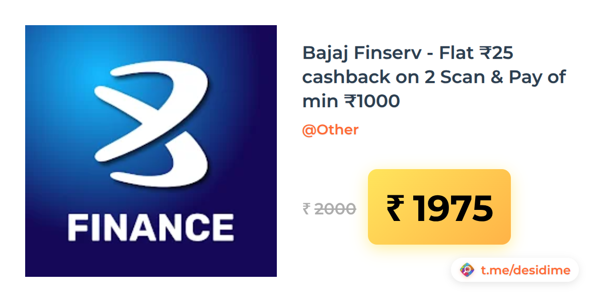 1% off on - Bajaj Finserv - Flat ₹25 cashback on 2 Scan & Pay of min ₹1000 - Rs. 1975