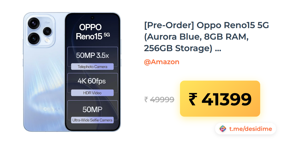 17% off on - [Pre-Order] Oppo Reno15 5G (Aurora Blue, 8GB RAM, 256GB Storage) with No Cost EMI/Additional Exchange Offers - Rs. 41399