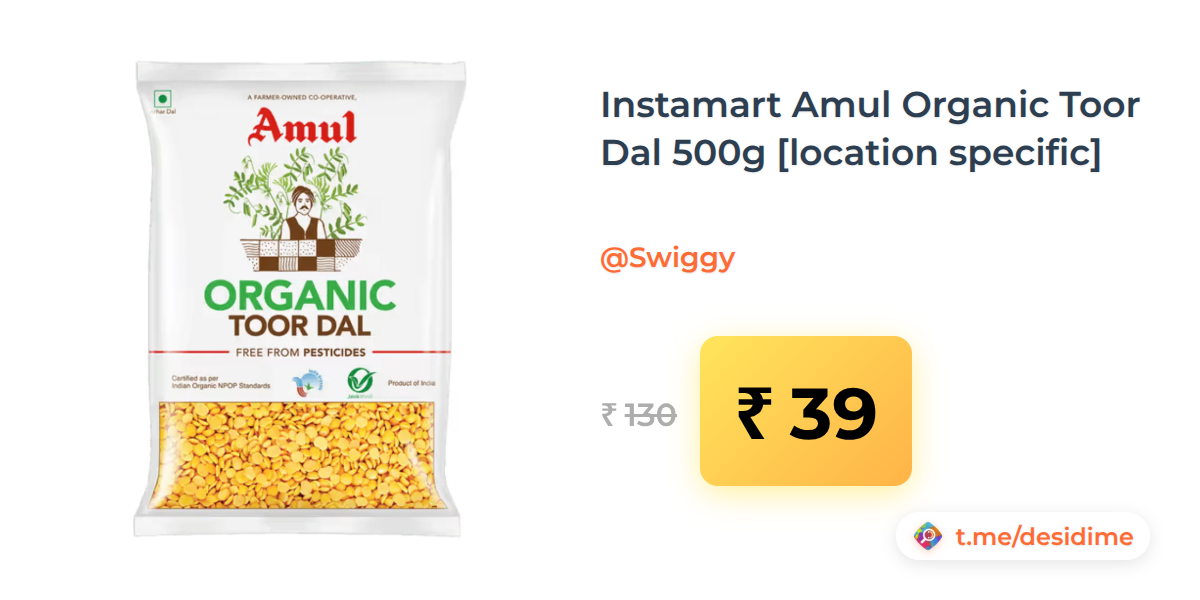 70% off on - Instamart Amul Organic Toor Dal 500g [location specific] - Rs. 39