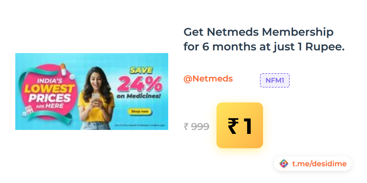 100% off on - Get Netmeds Membership for 6 months at just 1 Rupee. - Rs. 1