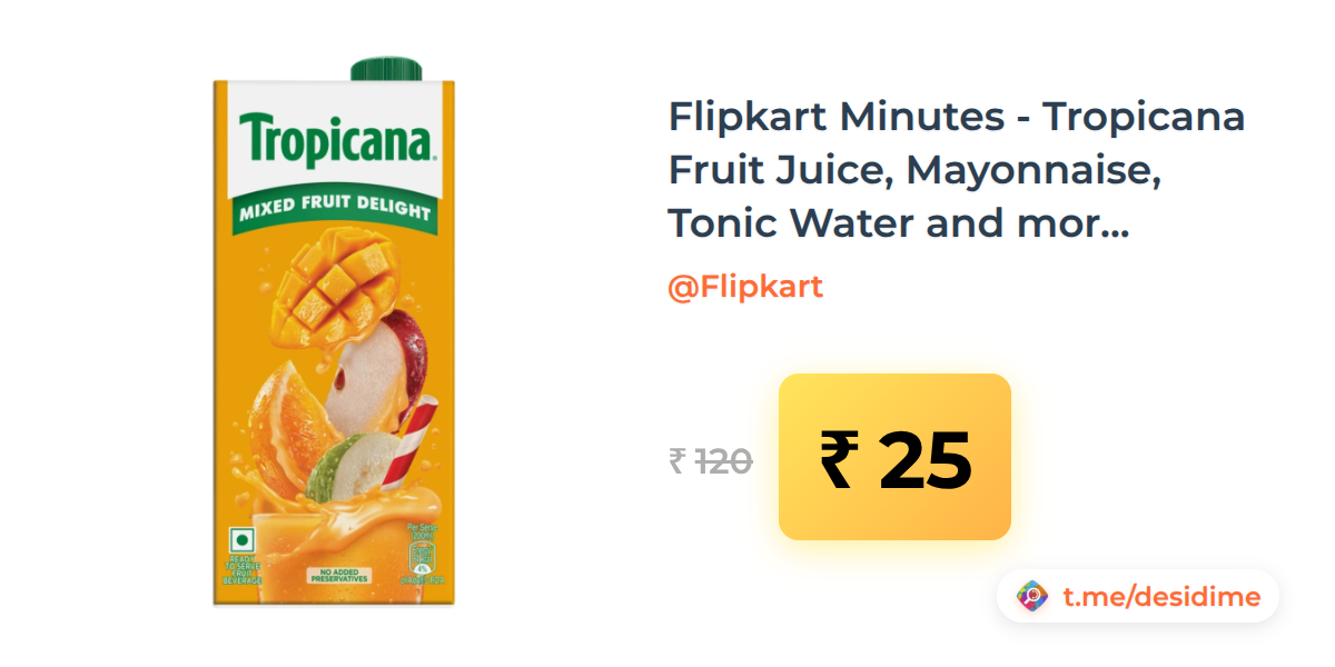 79% off on - Flipkart Minutes - Tropicana Fruit Juice, Mayonnaise, Tonic Water and more (location specific) - Rs. 25