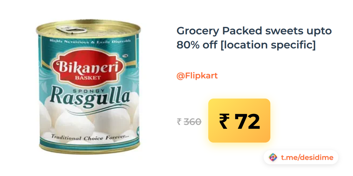 80% off on - Grocery Packed sweets upto 80% off [location specific] - Rs. 72