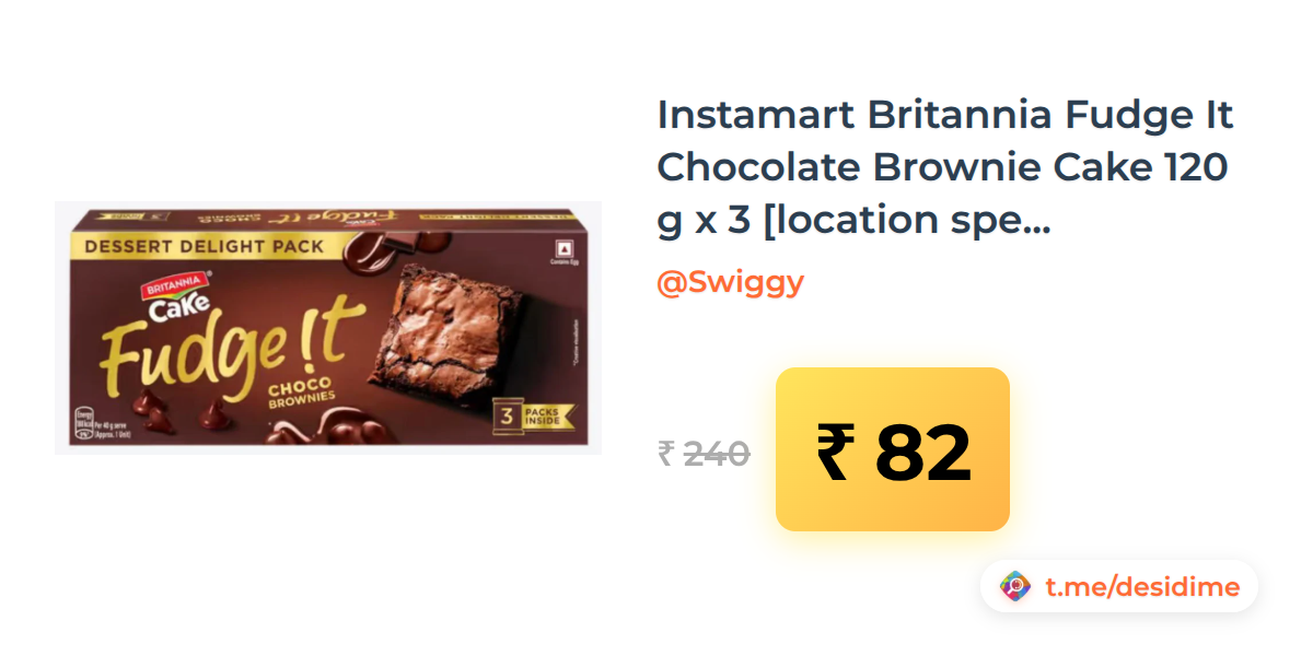 66% off on - Instamart Britannia Fudge It Chocolate Brownie Cake 120 g x 3 [location specific] - Rs. 82