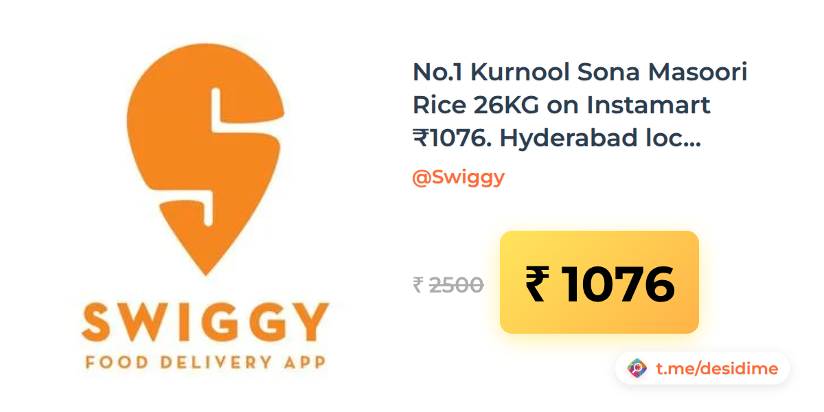 57% off on - No.1 Kurnool Sona Masoori Rice 26KG on Instamart ₹1076. Hyderabad location. Check yours. - Rs. 1076