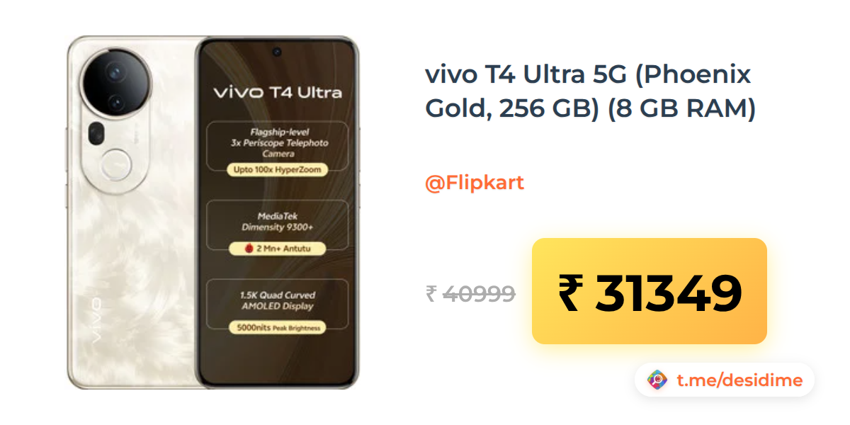24% off on - vivo T4 Ultra 5G (Phoenix Gold, 256 GB) (8 GB RAM) - Rs. 31349