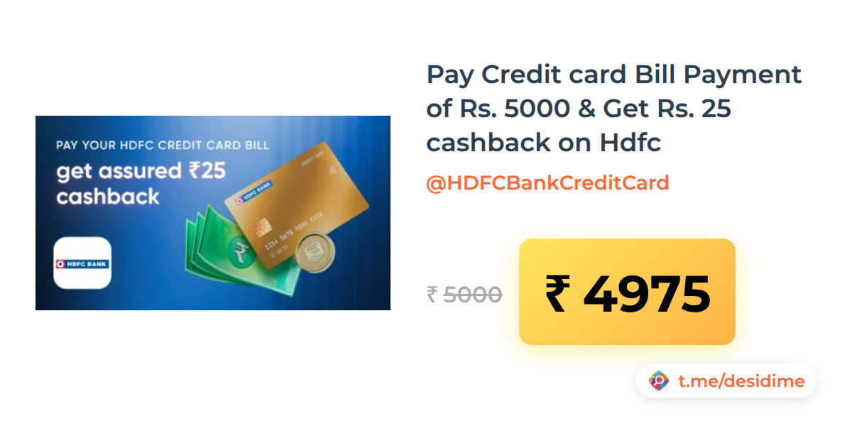 1% off on - Pay Credit card Bill Payment of Rs. 5000 & Get Rs. 25 cashback on Hdfc - Rs. 4975
