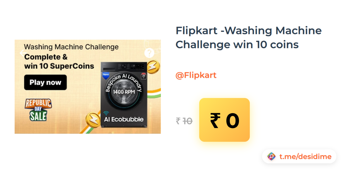 100% off on - Flipkart -Washing Machine Challenge win 10 coins - Rs. 0