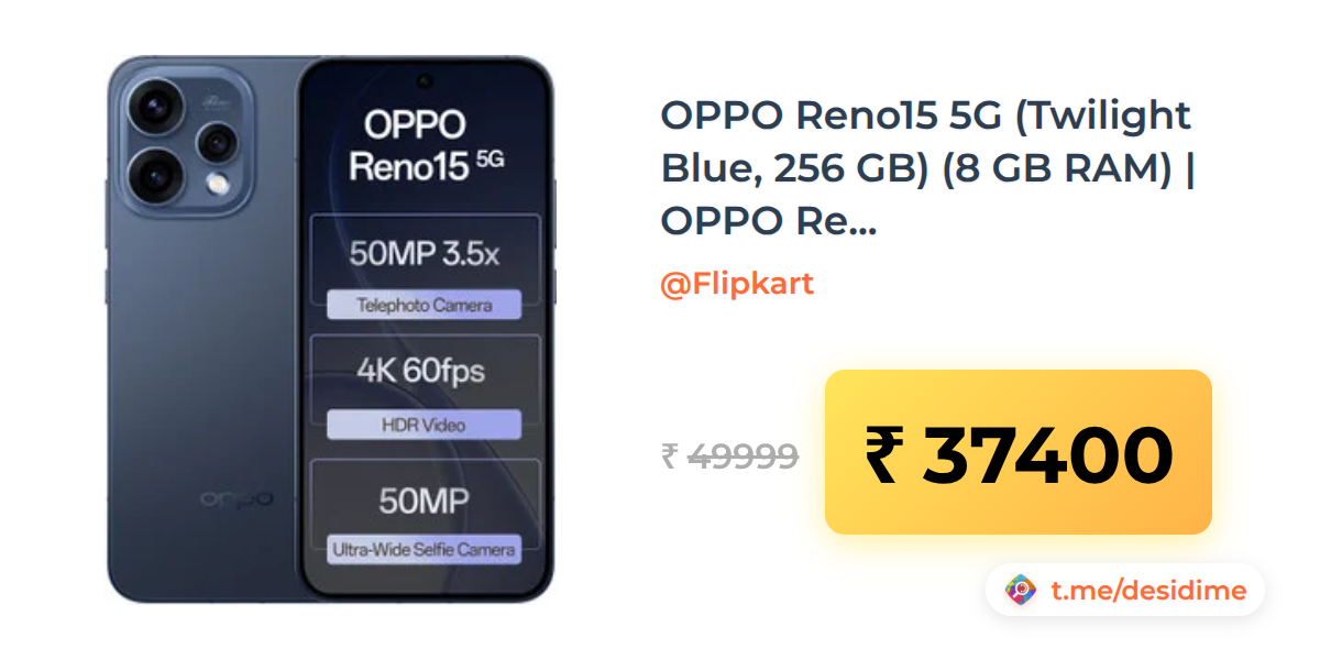 25% off on - OPPO Reno15 5G (Twilight Blue, 256 GB) (8 GB RAM) | OPPO Reno15 Pro - Rs. 37400