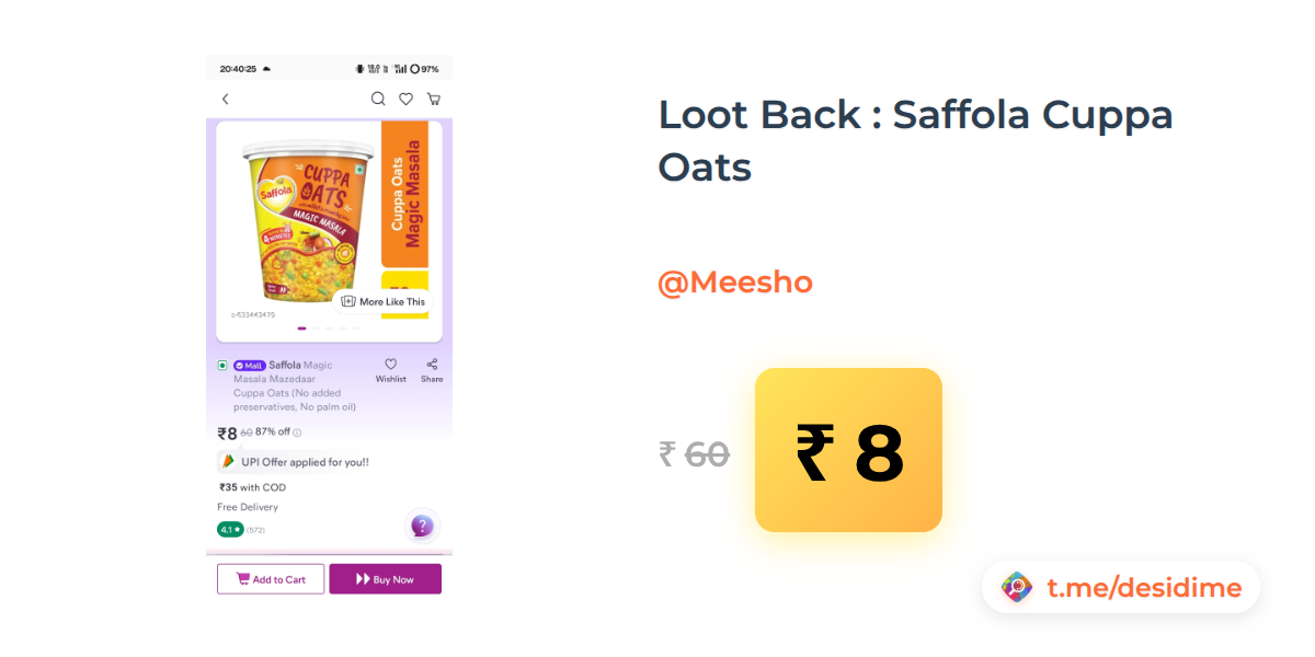 87% off on - Loot Back : Saffola Cuppa Oats - Rs. 8