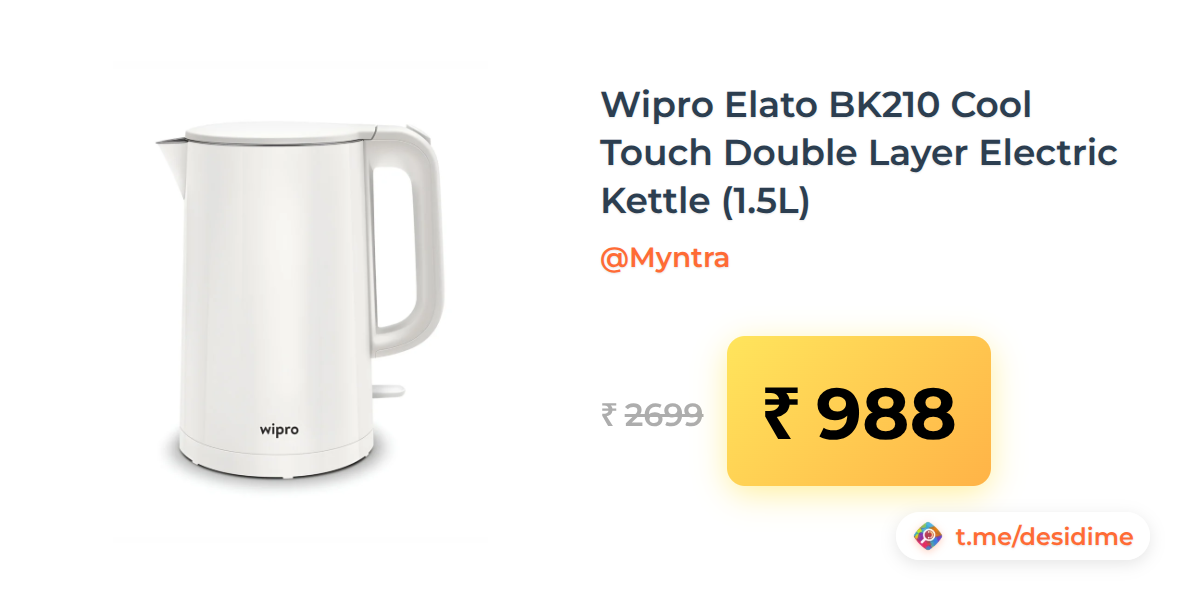 63% off on - Wipro Elato BK210 Cool Touch Double Layer Electric Kettle (1.5L) - Rs. 988