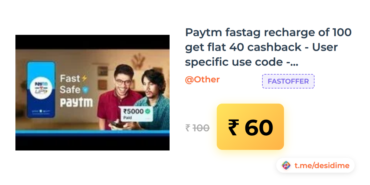 40% off on - Paytm fastag recharge of 100 get flat 40 cashback - User specific use code - FASTOFFER - Rs. 60