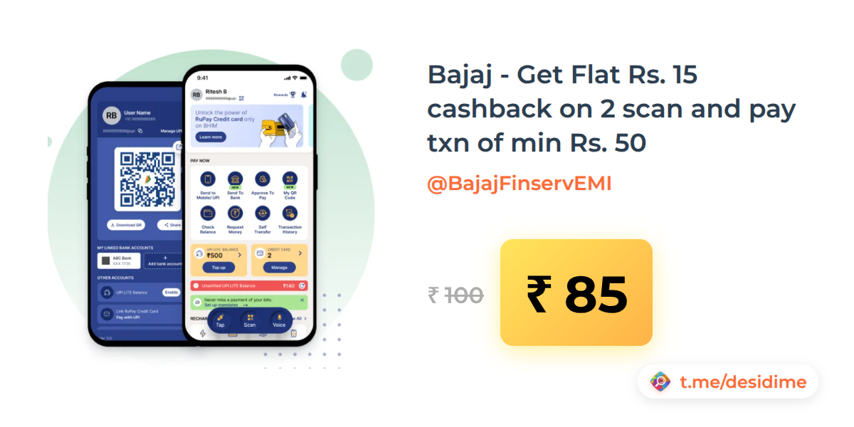 15% off on - Bajaj - Get Flat Rs. 15 cashback on 2 scan and pay txn of min Rs. 50 - Rs. 85